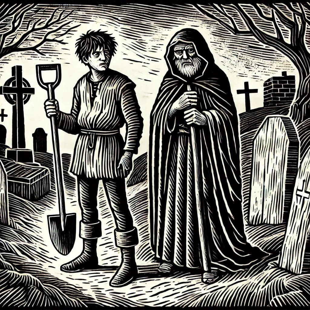 New youngster was truly promising. Strong shoulders allowed him to dig swiftly but his greatest advantage was his silence. They had torn out his tongue when he said something he shouldn't. Now, as we dug out the grave and an undead grabbed his ankle, he didn't make a sound. With a single strike of my spade, I ensured the undead was dead for good. I said to the youngster we needed to hurry. The light of a lantern on the path foreshadowed cemetery guards. I hated them more than the undead. Being a body snatcher is not an easy job.